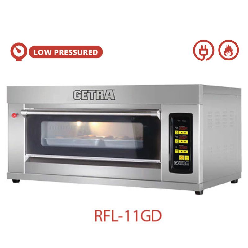 Seri gas baking oven RFL-GD hadir dengan pintu kaca tahan panas dengan tampilan lebih elegan dan lebih mudah memantau hasil panggangan, dengan fitur panel kontrol digital agar mudah dalam pengorasiannya, serta dengan 2 burner/ pengapian atas dan bawah dengan sistem ignition (pemantik) otomatis untuk hasil panggangan lebih merata.