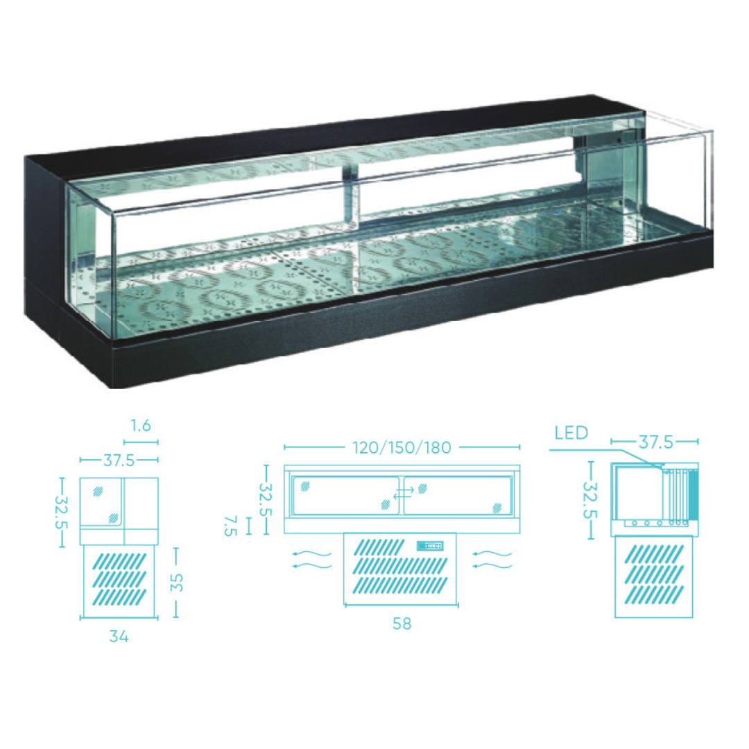 Drop-in sushi showcase kabinet display sushi yang memiliki visibilitas dari 3 sisi.