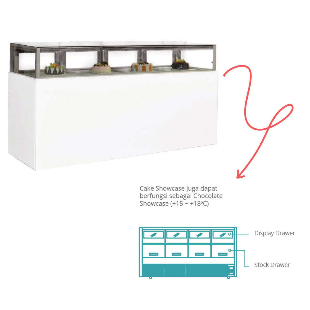 Rectangular Cake Showcase w/Drawer adalah pemajang kue dengan bentuk persegi yang menggunakan kaca datar. Kelebihan dari mesin ini adalah sudah menggunakan laci sehingga memudahkan untuk meletakkan atau mengambil kue.