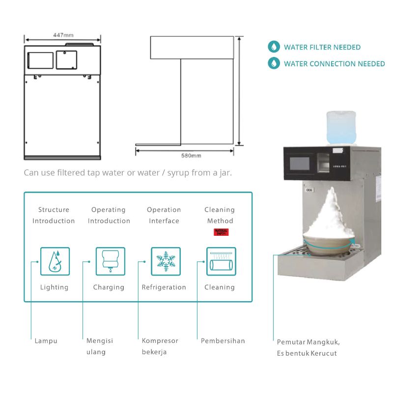 Snow Ice Maker adalah mesin yang mampu menghasilkan es salju putih (sumber air dari keran yang sudah difilter atau toples) dan es salju warna (sumber air/sirup dari toples) Jika diaplikasikan untuk es campur akan menimbulkan cita rasa yang sangat berbeda. cocok digunakan untuk : es campur, pendingin ikan, wine, ataupun dipadukan dengan minuman.
