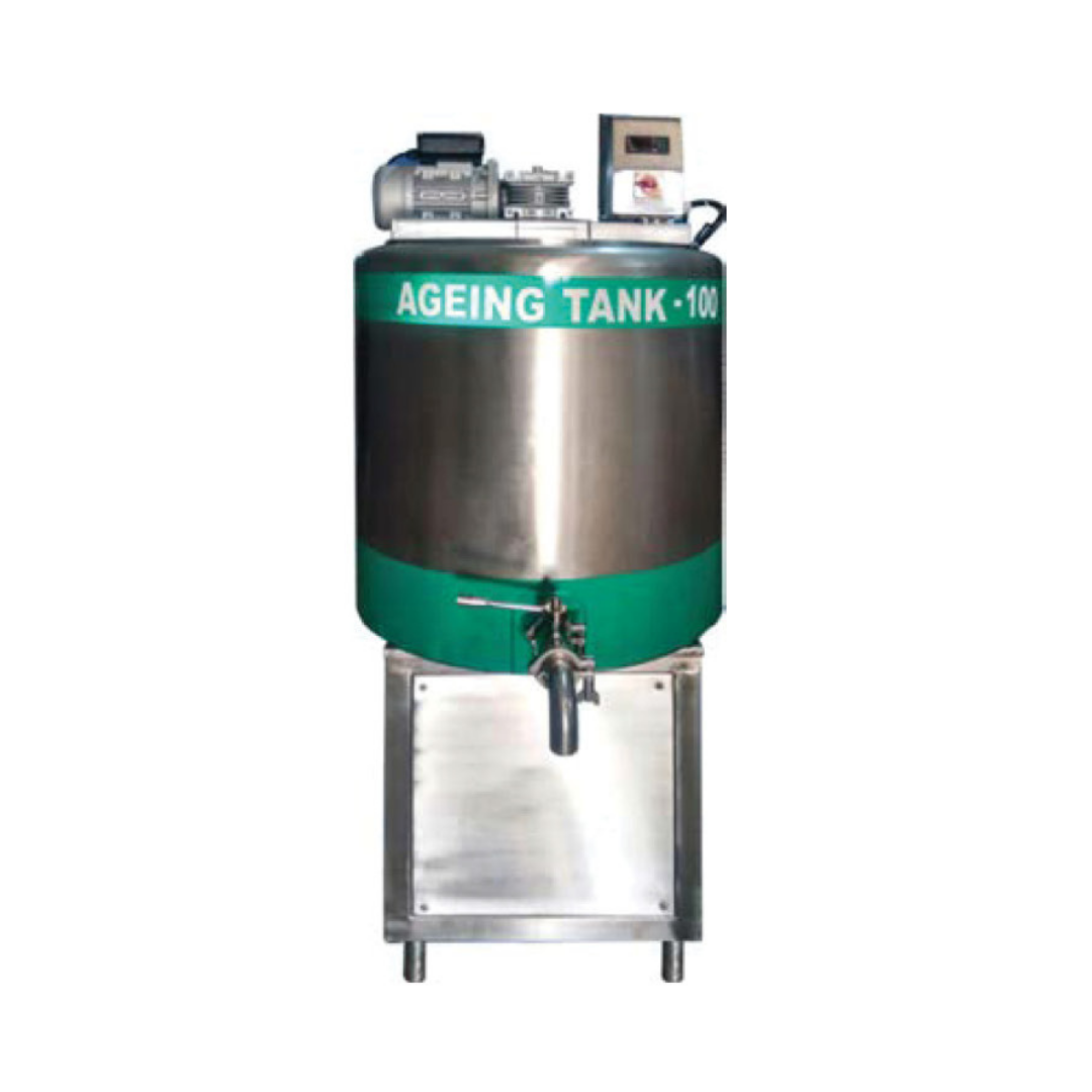 Ageing Tank merupakan tempat dimana mix es krim mengalami proses aging atau pendiaman pada suhu tertentu. Prinsip kerja tangki aging yaitu suatu mesin pengendali suhu ( thermostatic ). Tangki aging adalah double jacketed tank dimana ruang antar kedua jacket tersebut dapat dialiri air pendingin ( chiler ) sehingga suhu mix didalam tangki aging dapat dipertahankan.