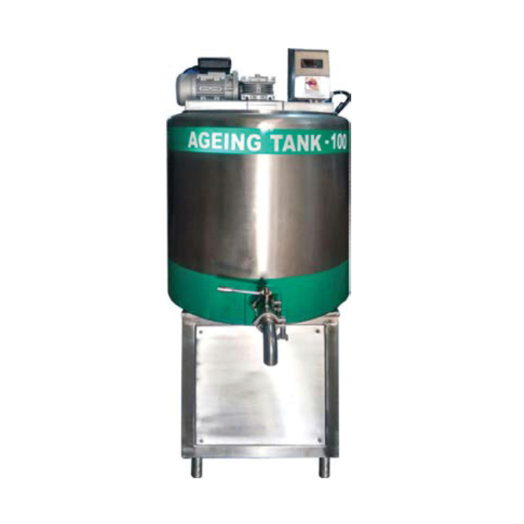 Ageing Tank merupakan tempat dimana mix es krim mengalami proses aging atau pendiaman pada suhu tertentu. Prinsip kerja tangki aging yaitu suatu mesin pengendali suhu ( thermostatic ). Tangki aging adalah double jacketed tank dimana ruang antar kedua jacket tersebut dapat dialiri air pendingin ( chiler ) sehingga suhu mix didalam tangki aging dapat dipertahankan.