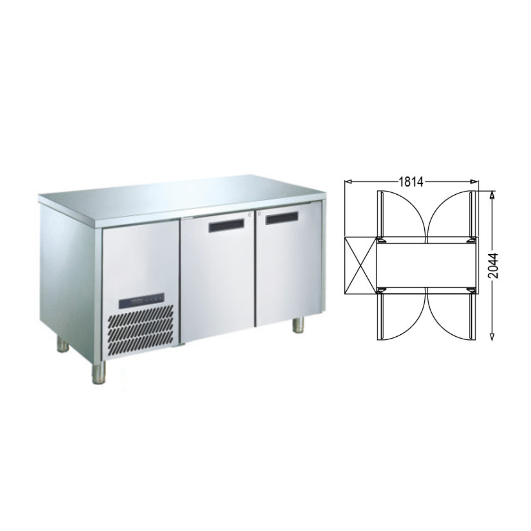 Stainless steel refrigerated cabinet berbentuk meja dengan suhu chiller untuk menyimpan daging, sayuran, buah, susu, minuman kemasan dan lain-lain. sehingga bahan makanan dan minuman bisa disimpan dan bertahan lebih lama, Undercounter chiller dapat diletakkan pada area dapur.