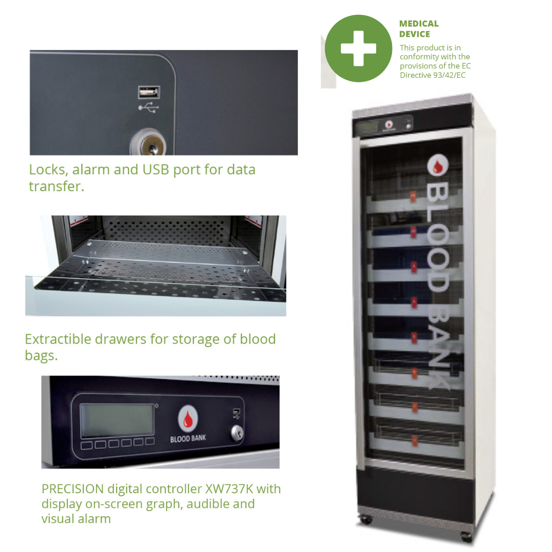Kabinet seri BBR dirancang untuk penyimpanan kantong darah yang terpercaya. dengan kapasitas penyimpanan hingga 160 kantong darah (@450ml) interior kabinet dari bahan stainless steel untuk menjaga higienitas produk.