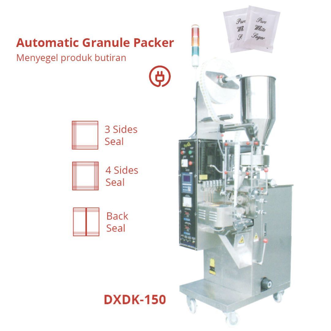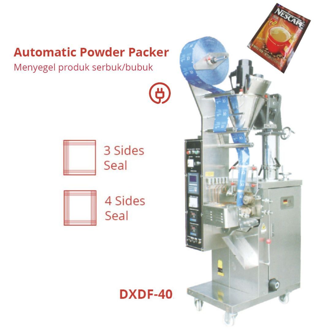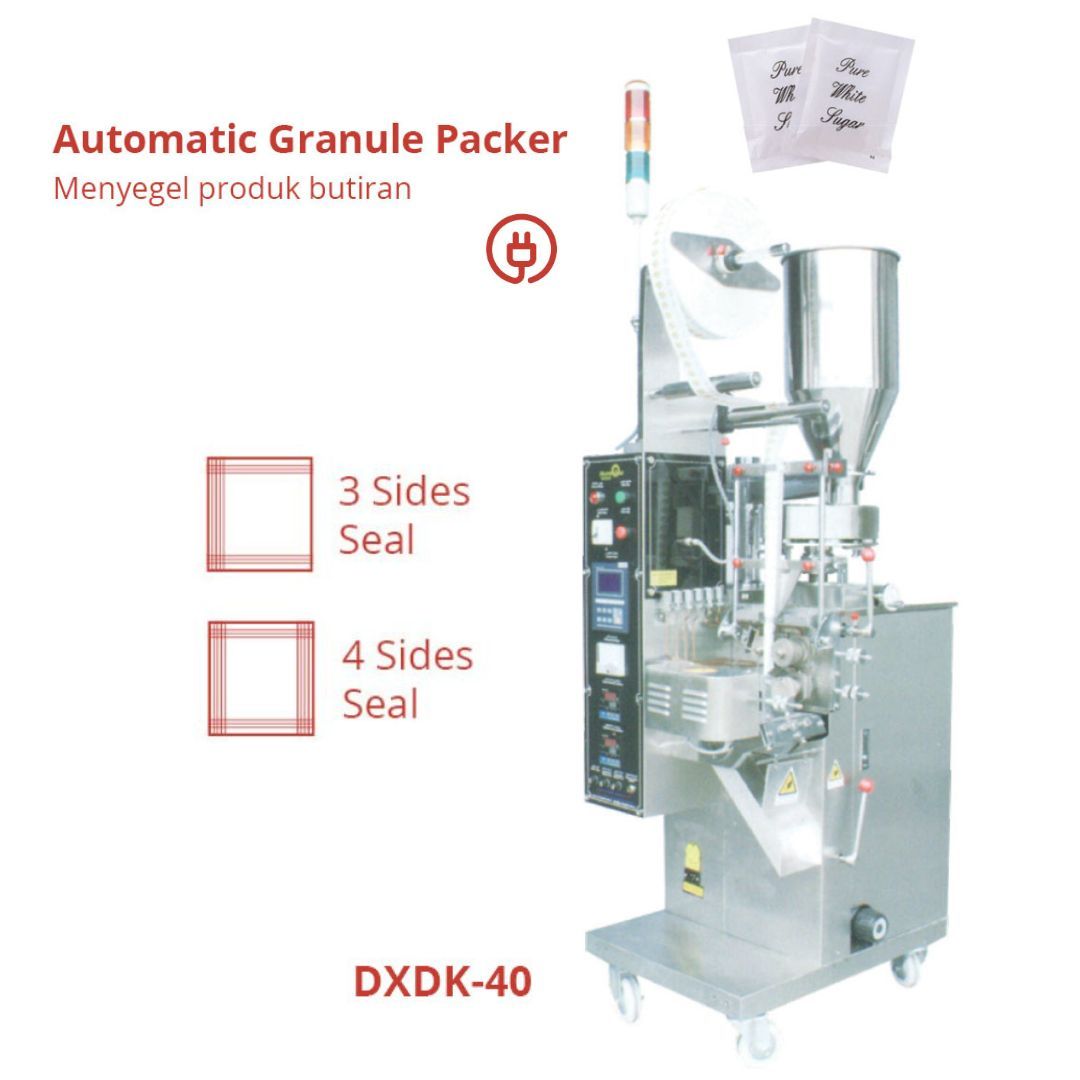 Mesin pengemas sachet secara otomatis dengan sensor dan mekanisme kontrol komputer, sehingga kecepatan mengemas lebih maksimal. Proses yang dikerjakan mulai dari membuat kantong, Menimbang, Mengisi, Menyegel, Memotong, Menghitung, Hingga Pengkodean.