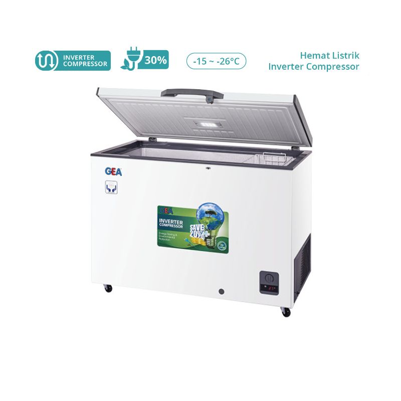 Chest Freezer merupakan box pembeku untuk menyimpan makanan dalam suhu dingin atau beku dengan suhu -15 ~ -26°C. Freezer berdaya listrik rendah dengan teknologi kompressor inverter yang beroperasi dengan rentang voltase 160 ~ 240V (hemat listrik inverter compressor).